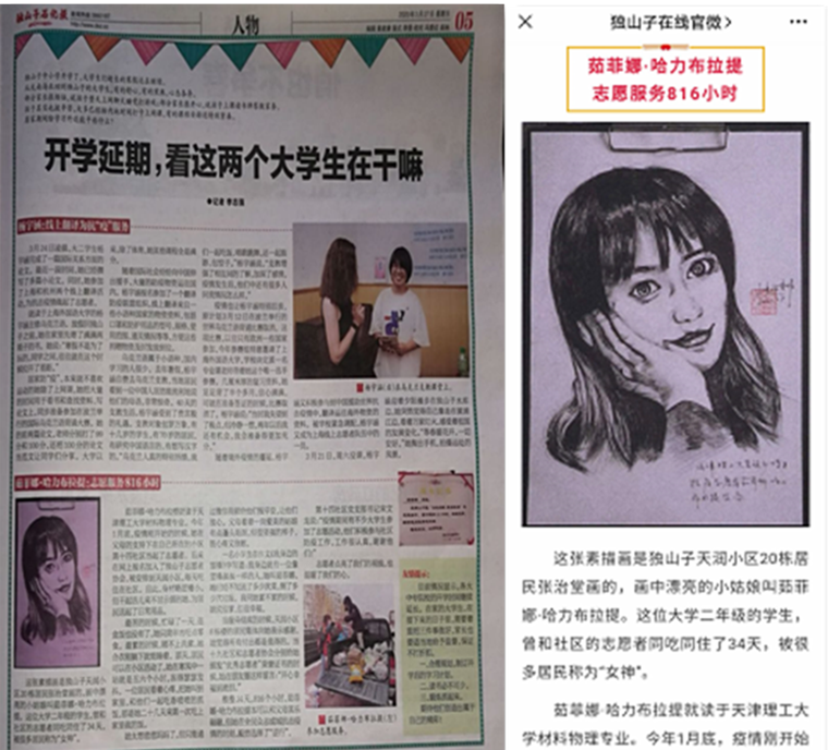 茹菲娜·哈力布拉提是贝博材料科学与工程学院2018级材料物理专业学生。疫情期间该生主动报名加入独山子志愿者协会,先后前往所在小区第十四社区和天润小区进行志愿服务,负责为居民采买、分发日用品,身材略显瘦弱的她干起活来却不甘示弱。最苦的时候,忙碌了一天连盒饭也没有了,她只能简单吃点零食。最累的时候,她顾不上洗漱,合衣躺下就能睡着。整整34天,816个小时的辛苦付出,也换来了当地居民的衷心感谢和认可,茹菲娜被很多居民亲切的称为“女神”,独山子天润小区20栋的居民张治堂更是为茹菲娜画了一副素描画,当地的一名小学生在作文里写到“我身边就有一位像雷锋叔叔一样的人,她叫茹菲娜。”