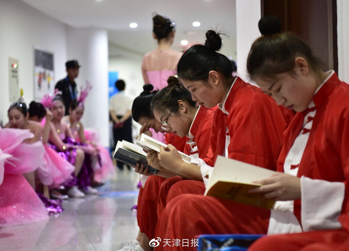 同学们利用候场休息时间看书,给大脑充充电。