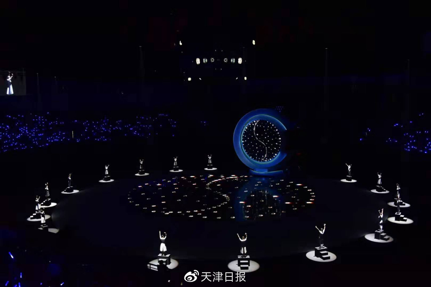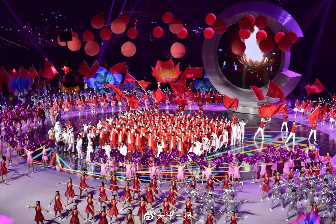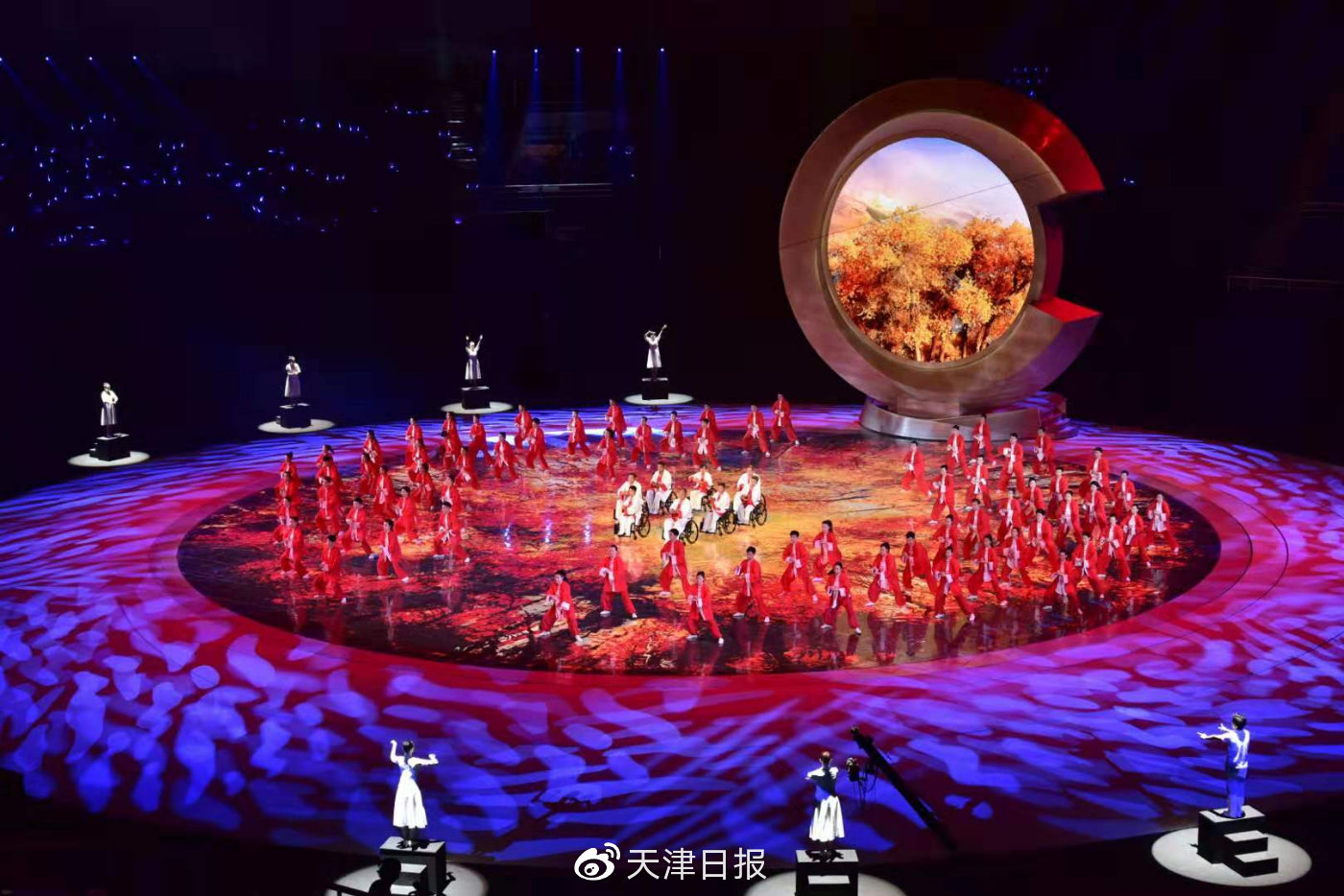 台上手语老师与同学们一起,在动作、队形变换中展示太极刚柔相济的精髓,为残运会开幕